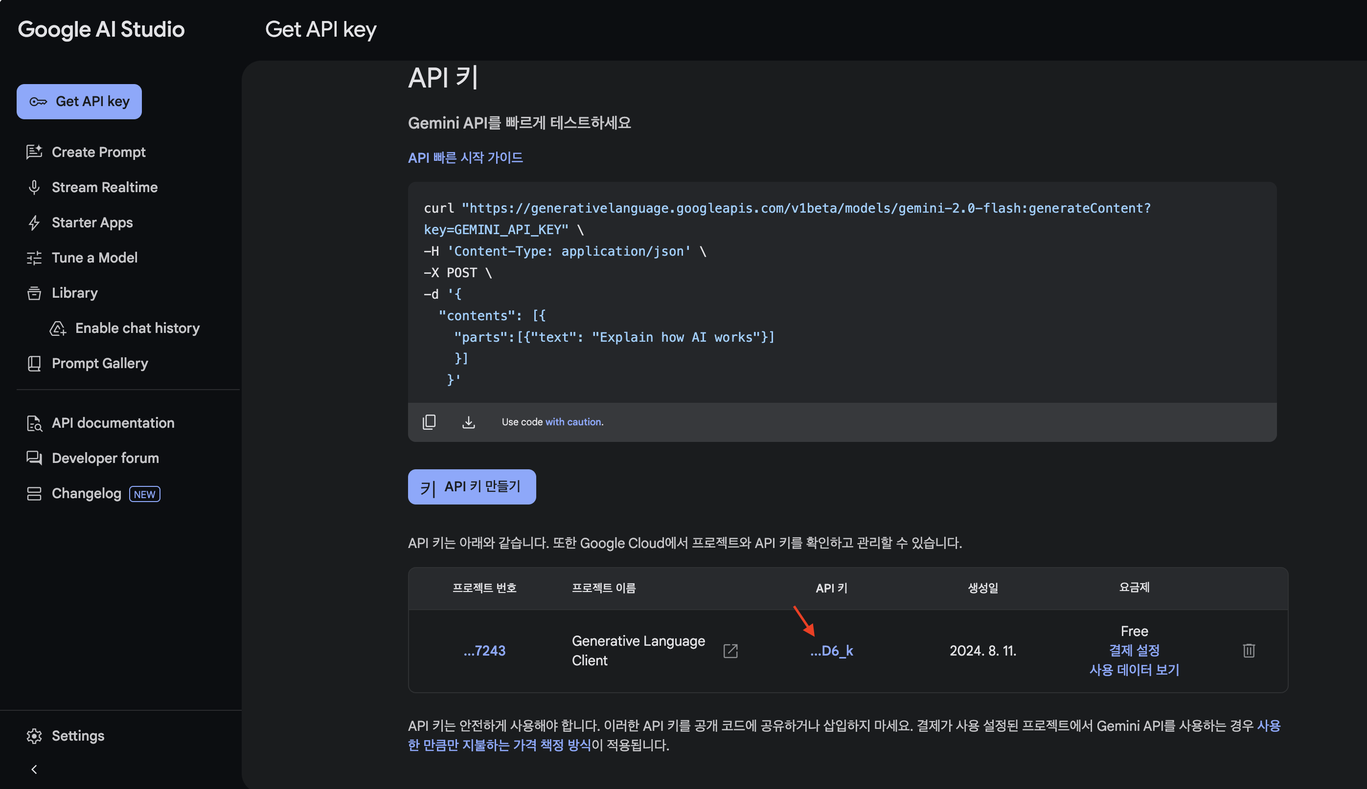 api key는 google ai studio에서 가져올 수 있습니다.